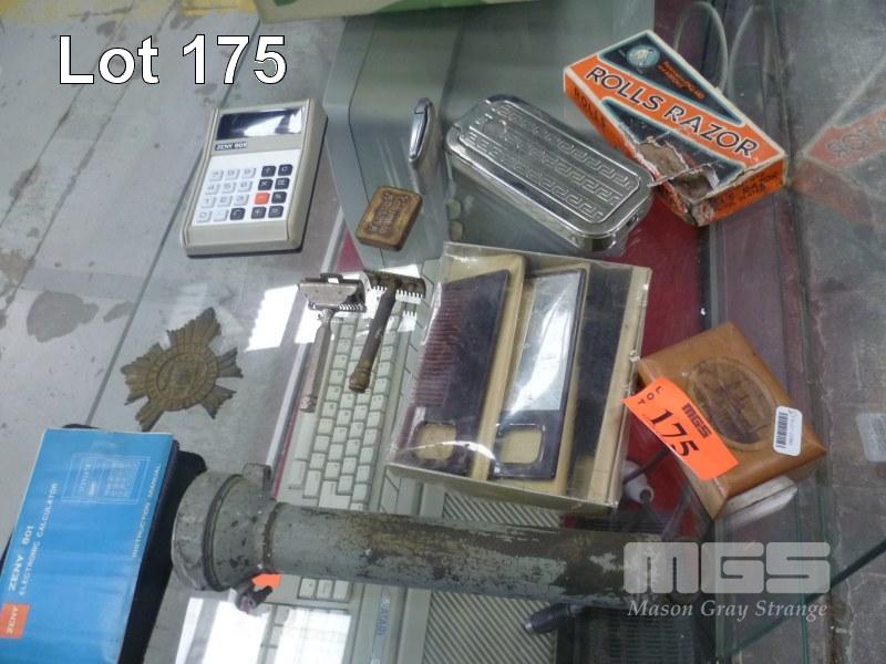 ASSORTED VINTAGE ITEMS INC ROLLS RAZOR CIG LIGHTER, BRASS TORCH, ZENY CALCULATOR, TINS, ETC
