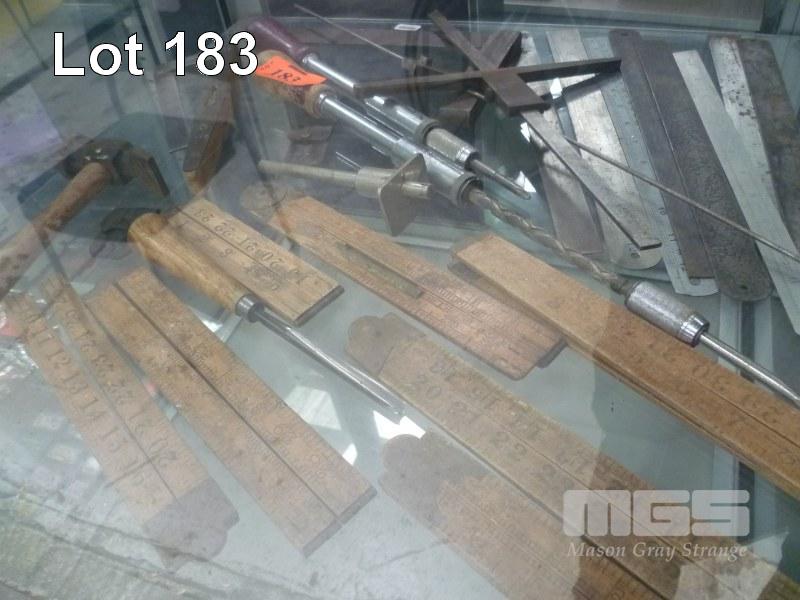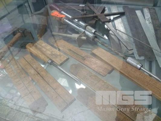 VINTAGE MEASURING TOOLS, RULES, STEEL, BOX WOOD, LEVEL, HAMMERS, SQUARES, ETC