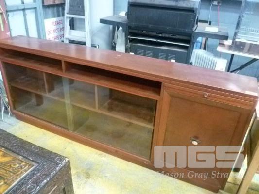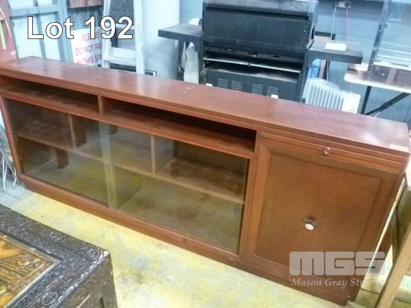 LOWLINE MAHOGANY STAINED CABINET WITH 2 X SLIDING GLASS DOOR FRONTAGE, SINGLE DOOR STORAGE & SLIDE OUT TRAY