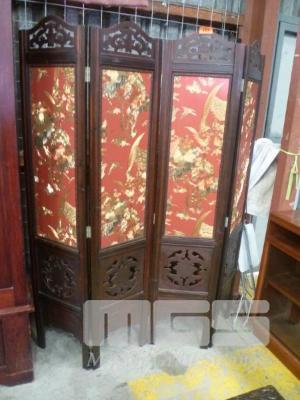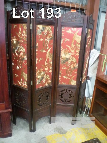 ORIENTAL PRIVACY SCREEN, ORNATE CARVED TIMBER 4 PANEL SCREEN WITH SILK INLAY PANELS