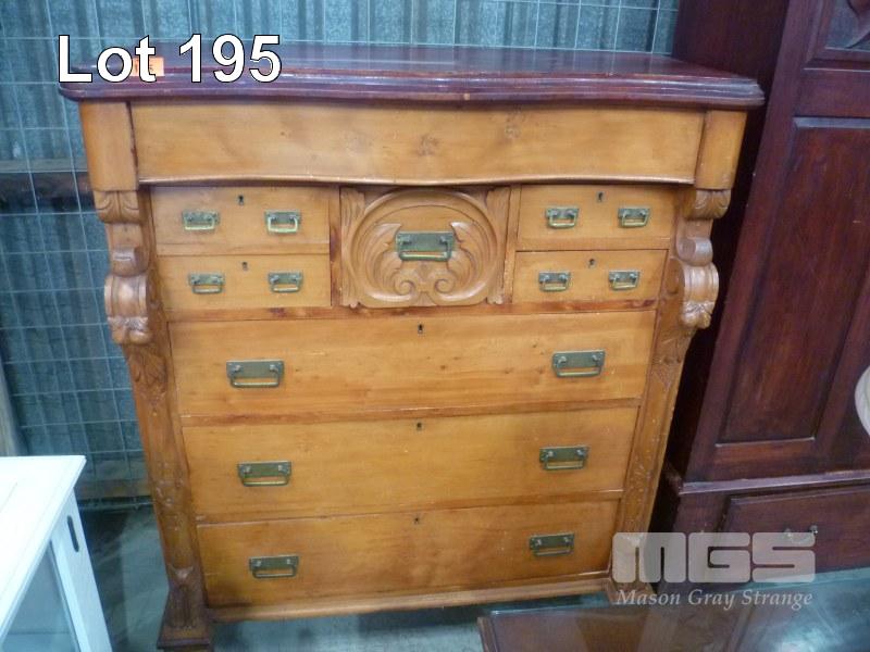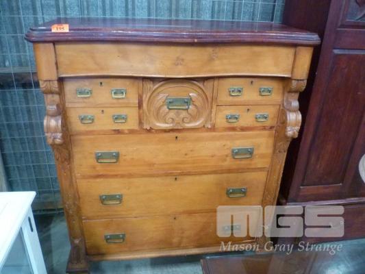 HUON PINE CHEST OF 8 DRAWERS, CARVED COLUMNS, BRASS HANDLES