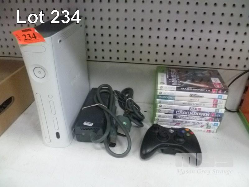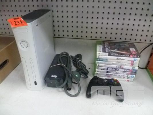 XBOX 360 GAMING CONSOLE, POWER SUPPLY, CONTROLLER & GAMES