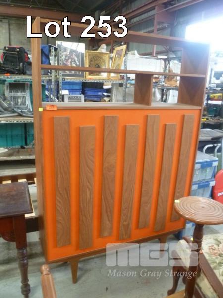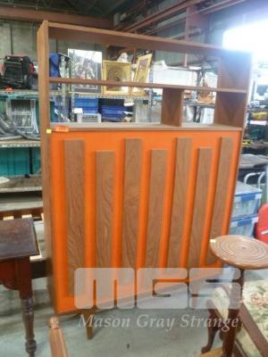MID CENTURY TEAK ROOM DIVIDER WITH ORANGE FACADE