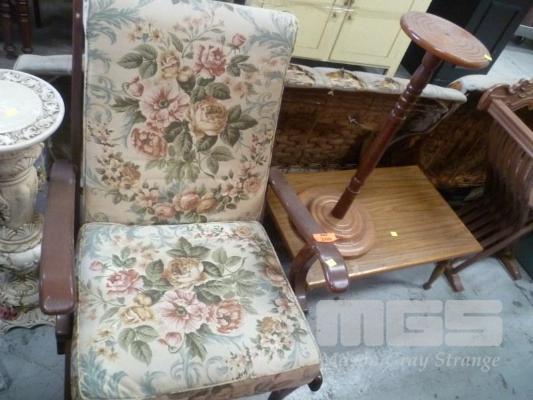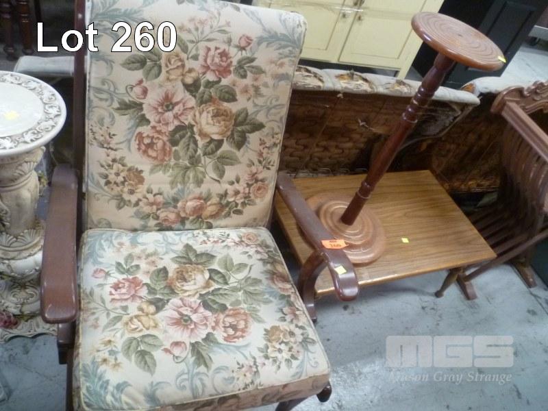 OCCASIONAL ARMCHAIR, TIMBER PEDESTAL & COFFEE TABLE