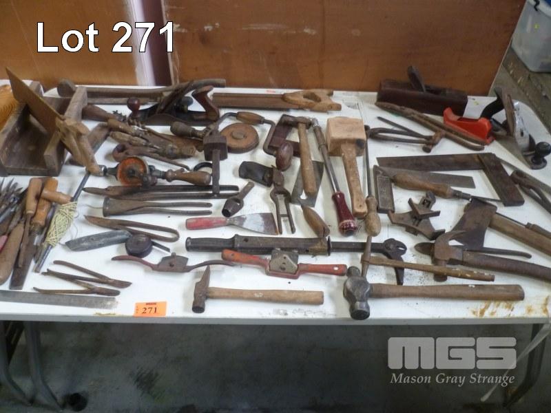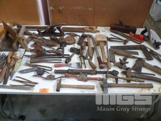 VINTAGE CARPENTERS TOOLS INC CHISELS, WOOD PLANES, HAND DRILLS, HAMMERS, SPOKE SHAVES, HATCHET, MALLET, SAWS, SQUARES, CLAMP, TAPE MEASURES, ETC