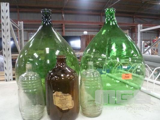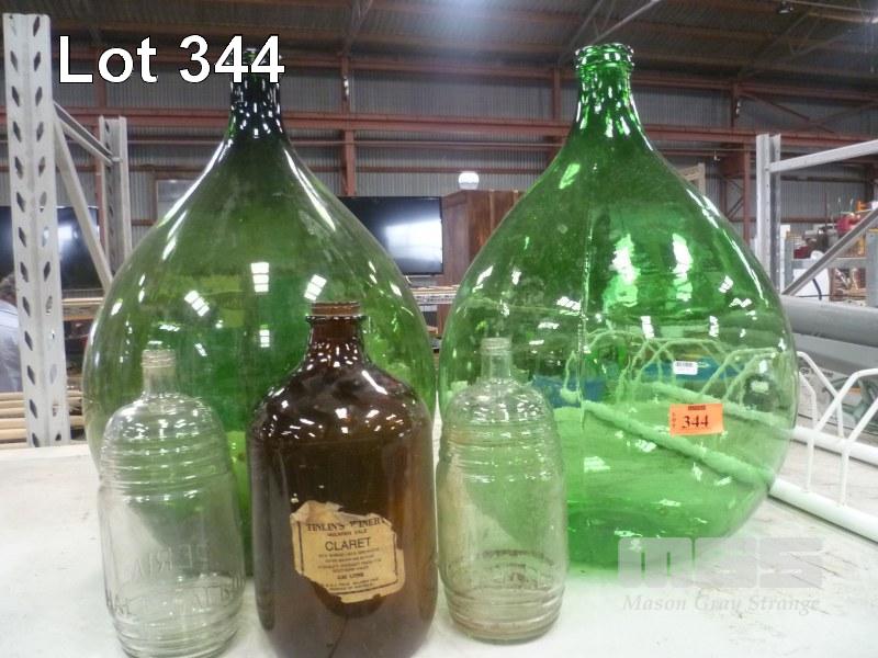 2 x LARGE ANTIQUE-GREEN GLASS DEMIJOHNS, 2 x VINTAGE "HALF GALLON" BOTTLES AND VINTAGE "TINLIN'S WINERY" FLAGON.