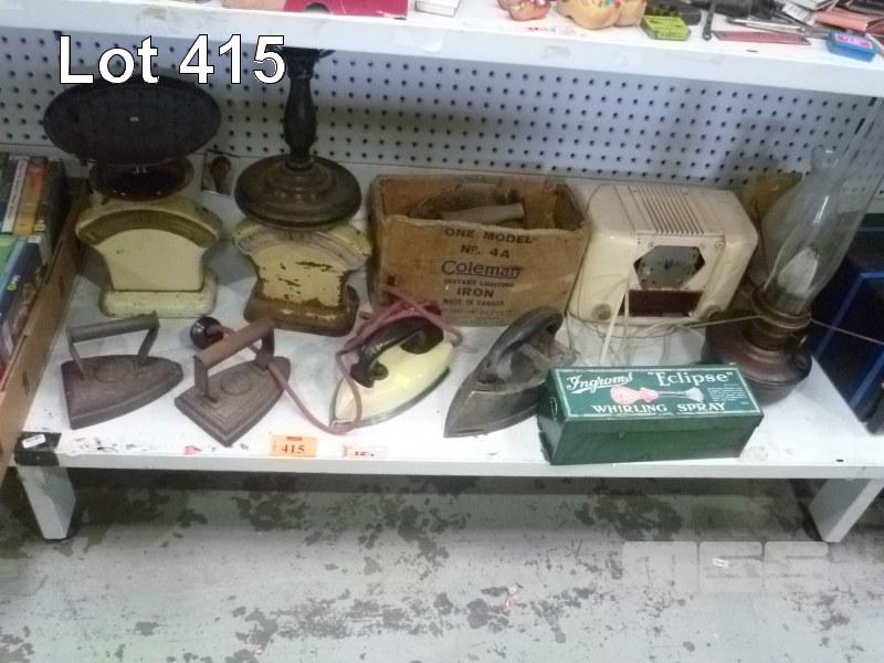 ASSORTED VINTAGE ITEMS INC KEROSENE LAMPS, IRONS, SCALES, INGRAM ECLIPSE WHIRLING SPRAY, ETC