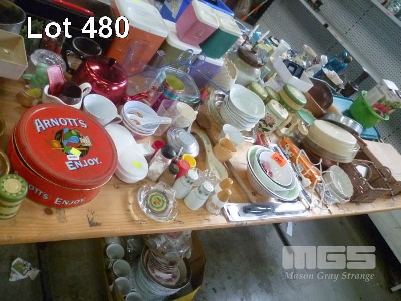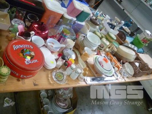 ASSORTED KITCHENWARE, CUTLERY, UTENSILS, ETC, 1 x TABLE
