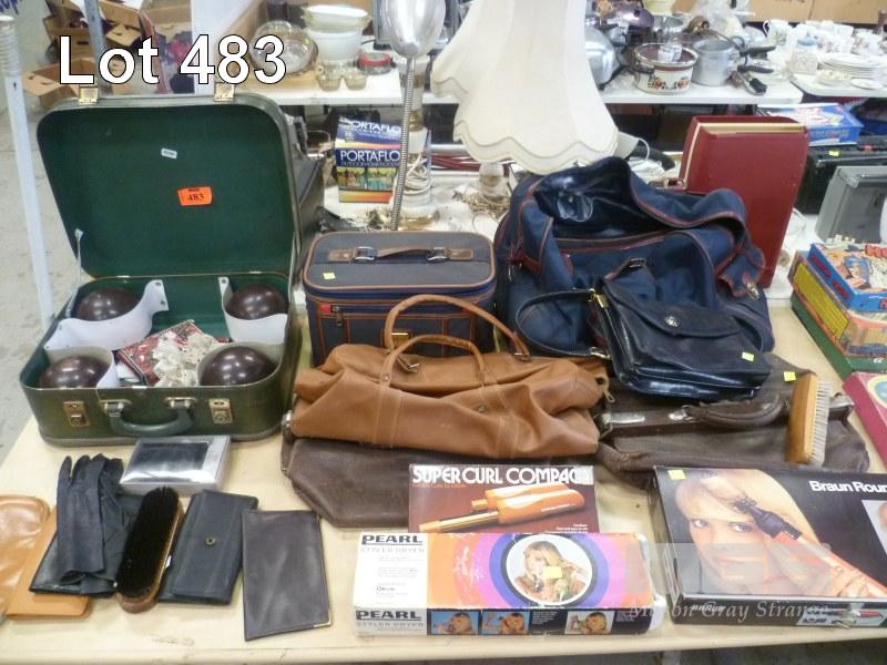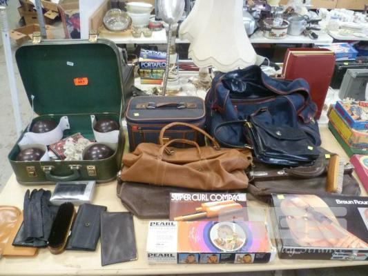 SET HENSELITE LAWN BOWLS, GLADSTONE BAGS, HAIR STYLERS, BAGS, ETC, 1 x TABLE