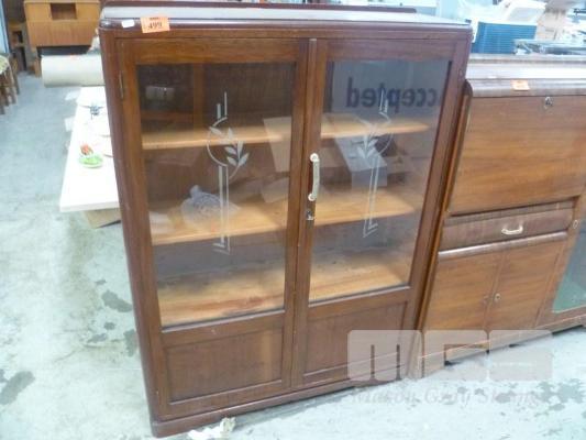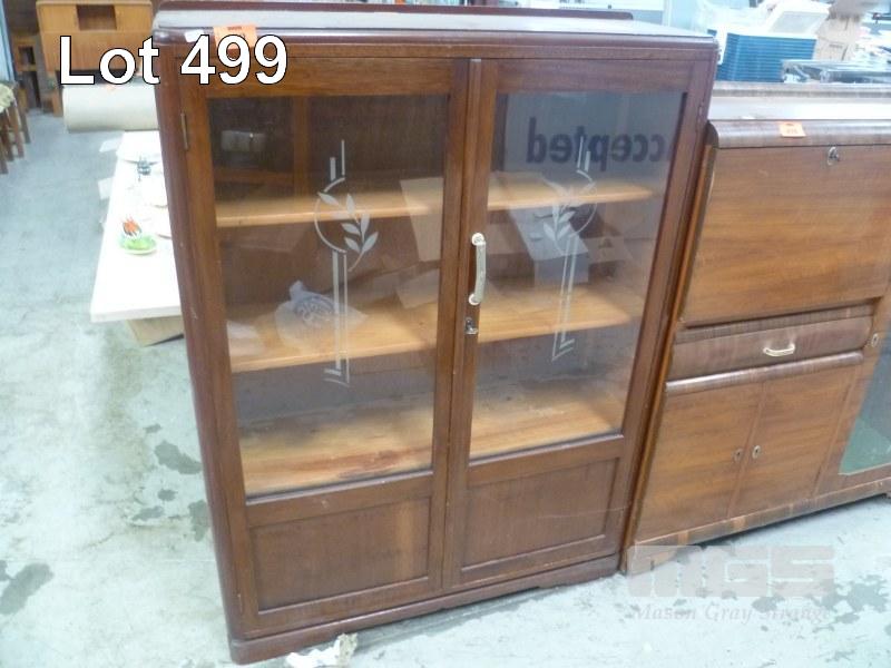ART DECO TIMBER DISPLAY CABINET, ETCHED GLASS DOORS, 3 x TIMBER SHELVES