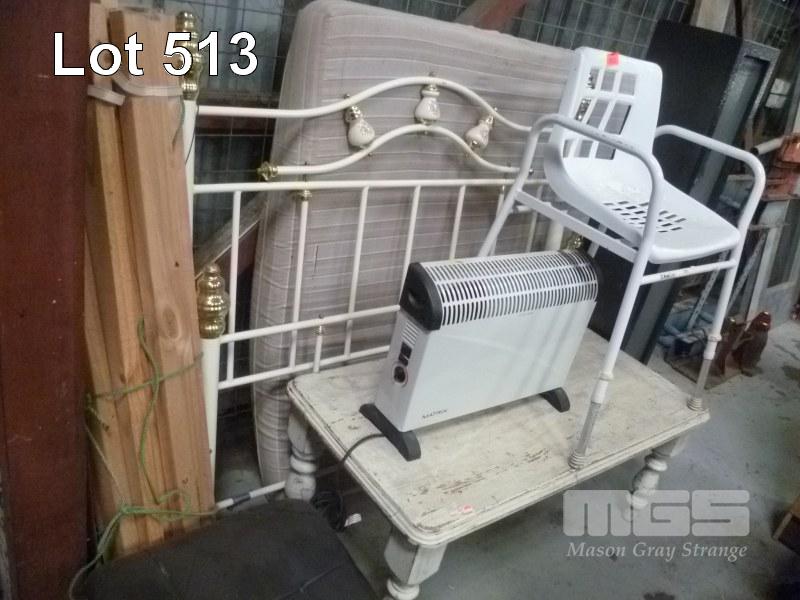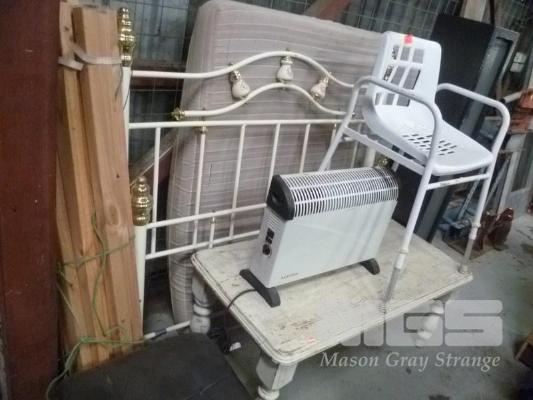 QUEEN SIZE BED, HEATER, ASSIST CHAIR, COFFEE TABLE