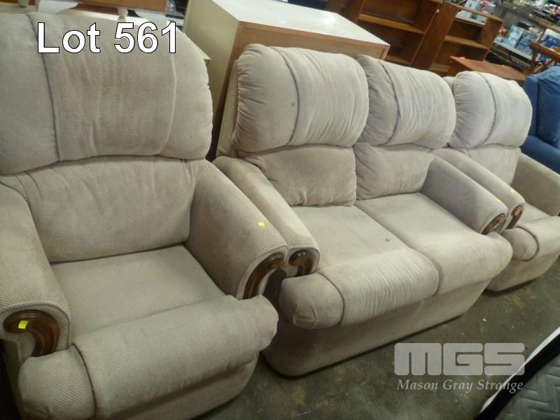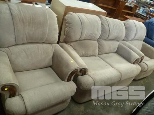 BIEGE FABRIC, TIMBER INLAY, 3 PIECE LOUNGE SUITE, INC; 2 SEATER & 2 X SINGLES