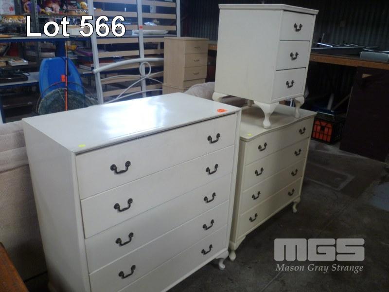 WHITE, TIMBER 3 PIECE BEDROOM SUITE, INC; 2 X TALLBOYS & BEDSIDE CABINET