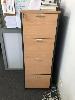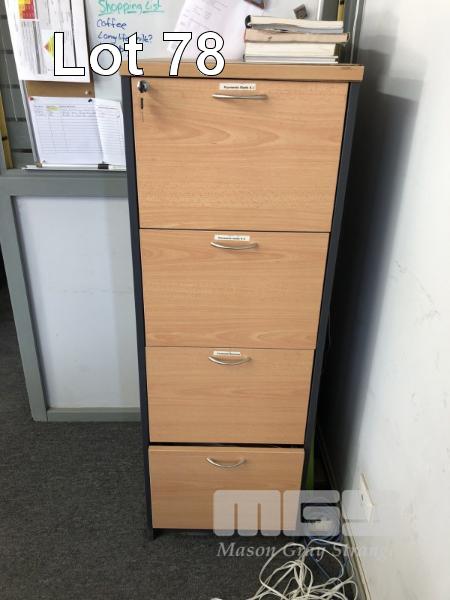 TIMBER LAMINATE DESK & RETURN, BEECH/STORM LAMINATE WITH GAS LIFT OFFICE CHAIR & 4 DRAWER MATCHING FILING CABINET