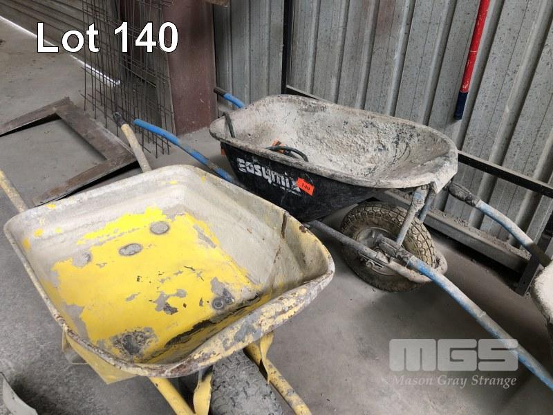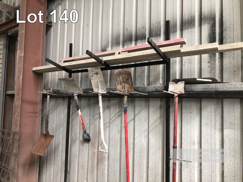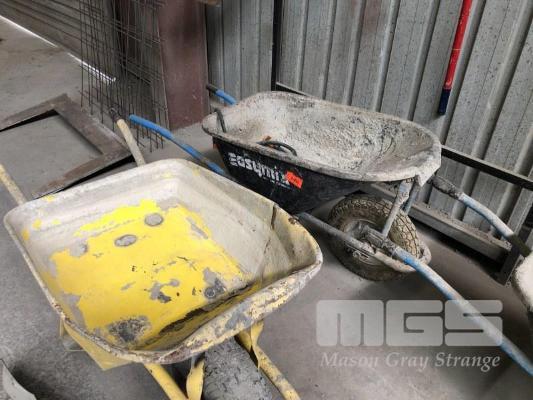2 x BUILDERS WHEEL BARROWS, 3 x CONCRETE SCREEDS, 2 TO 3m, ASSORTED SHOVELS & BROOMS