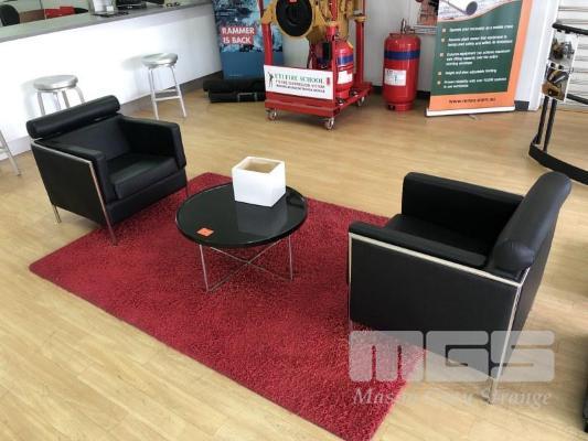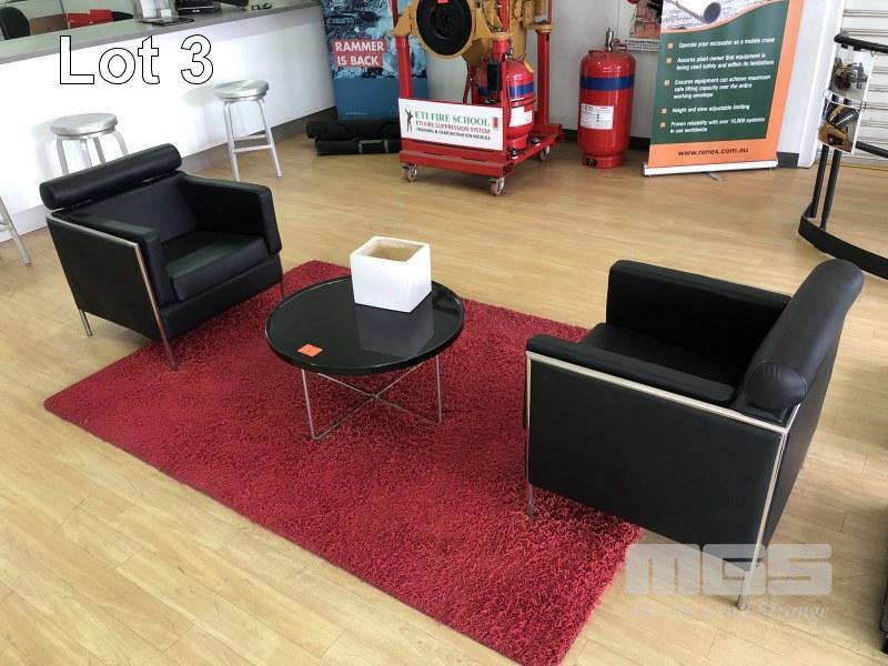 2 x BLACK LEATHER CHAIRS, CHROME ARM RESTS, ADJUSTABLE HEAD RESTS WITH MATCHING COFFEE TABLE, 720mm & RED FLOOR RUG, 2300 x 1300mm