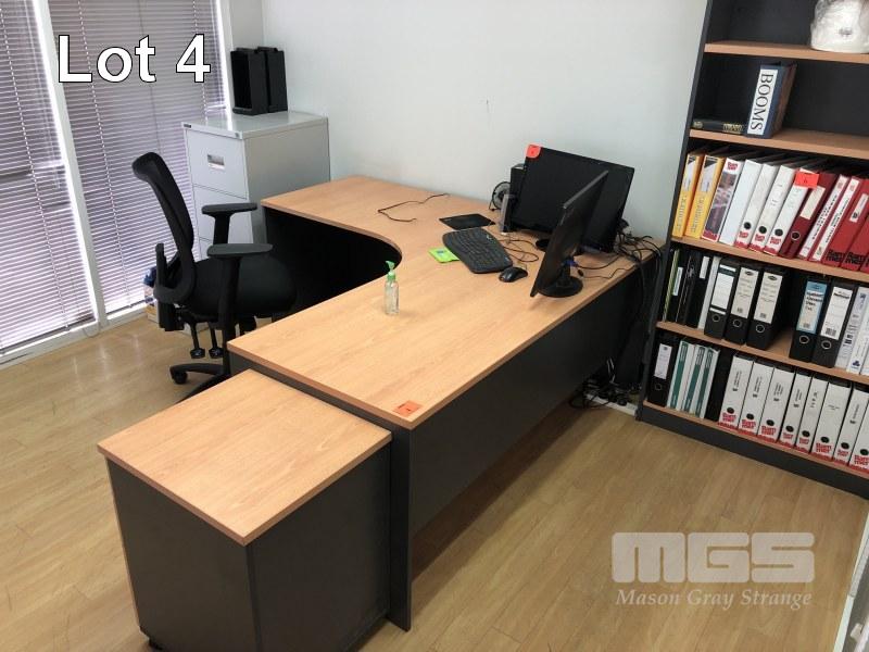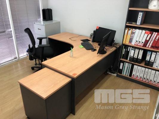 TIMBER LAMINATE DESK & RETURN, BEECH STORM. 1800 x 1800mm WITH GAS LIFT CHAIR, BLACK CLOTH, MATCHING TIMBER LAMINATE UNDER DESK MOBILE WITH MATCHING BOOKSHELF, 5 TIER & GODFREY 3 DRAWER STEEL FILING CABINET, NO KEY