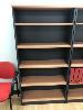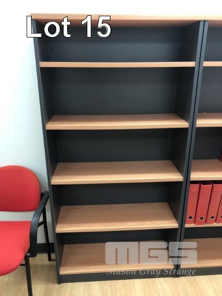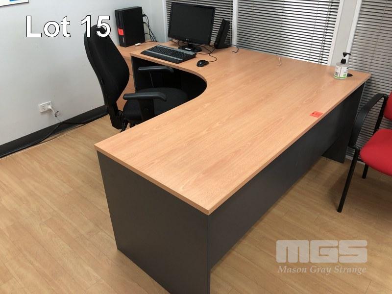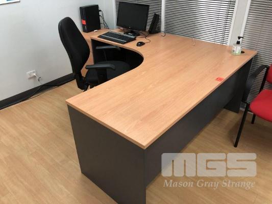 TIMBER LAMINATE DESK & RETURN, BEECH STORM. 1800 x 1800mm WITH GAS LIFT CHAIR, BLACK CLOTH, MATCHING TIMBER LAMINATE UNDER DESK MOBILE WITH TIMBER LAMINATE BOOKSHELF, 5 TIER, 1800 x 900mm