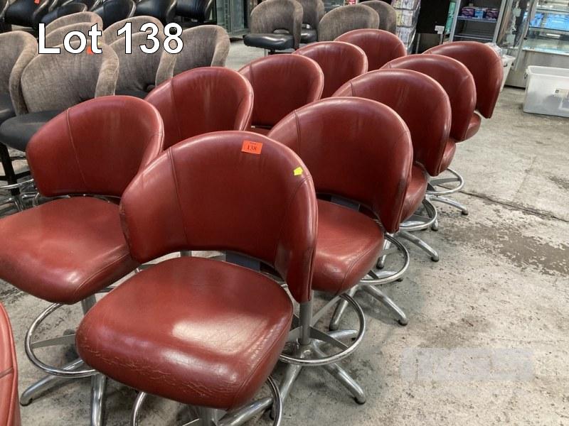 10 x SWIVEL POKIE/BAR STOOLS, MAROON VINYL (SOME WORN)