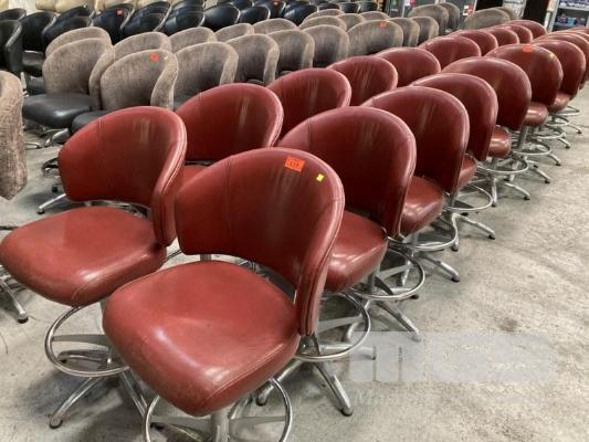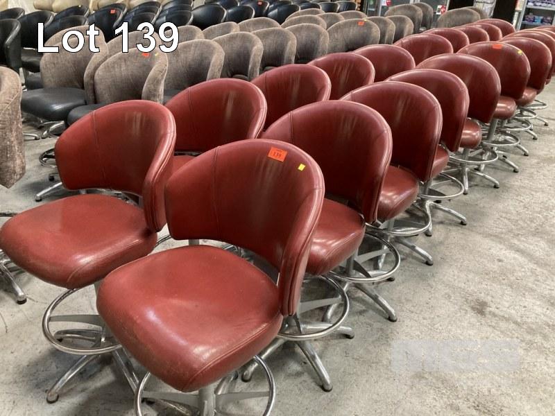 10 x SWIVEL POKIE/BAR STOOLS, MAROON VINYL (SOME WORN)