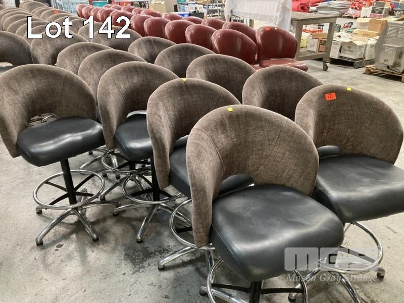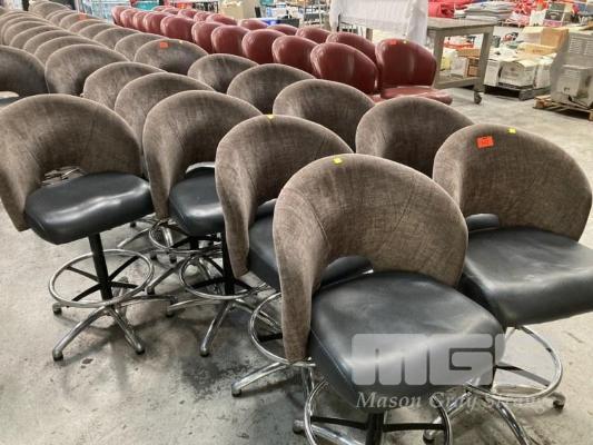 11 x SWIVEL POKIE/BAR STOOLS, BLACK VINYL SEAT/FABRIC BACK, (SOME WORN)