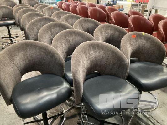 11 x SWIVEL POKIE/BAR STOOLS, BLACK VINYL SEAT/FABRIC BACK, (SOME WORN)
