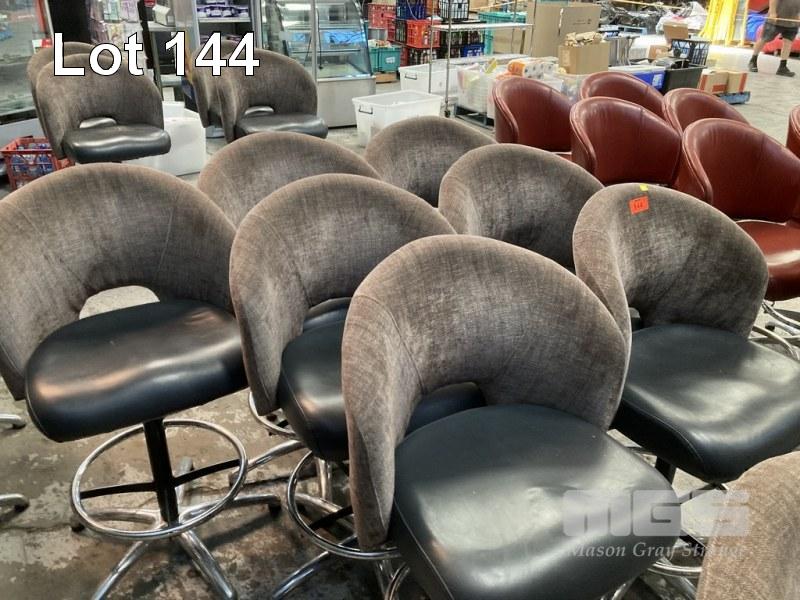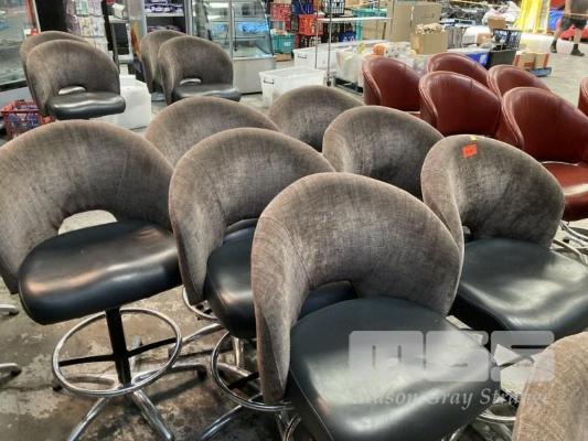 11 x SWIVEL POKIE/BAR STOOLS, BLACK VINYL SEAT/FABRIC BACK, (SOME WORN)