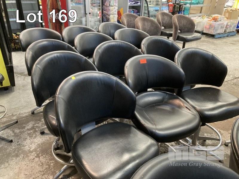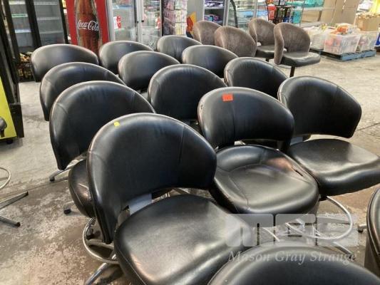12 x SWIVEL POKIE/BAR STOOLS, BLACK VINYL, (SOME WORN)