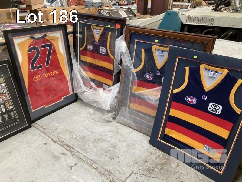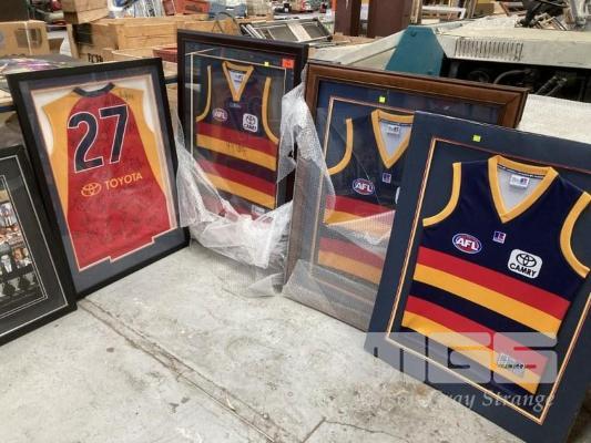 4 x ASSORTED ADELAIDE CROWS GUERNSEYS (FRAMED & UN-FRAMED), 1 DAMAGED GLASS