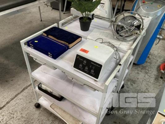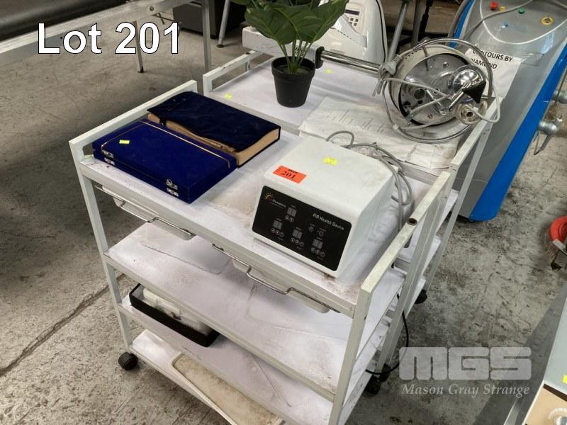 FACE STEAMER, MOD: T-202A 240V WITH FIR HEALTH SAUNA MACHINE, SUN DYNAMICA (ENCLOSURE NOT INCLUDED), CONDITION UNKNOWN INCLUDES 2 x MOBILE TROLLEYS, WHITE & CONTENTS