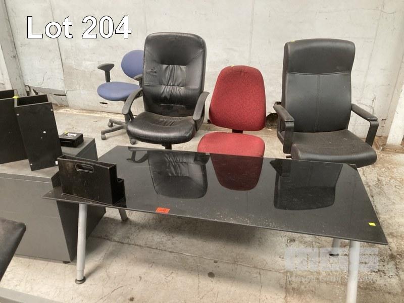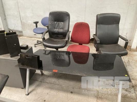 OFFICE FITOUT INCLUDING GLASS TOP DESK, (MISSING LEG), 3 x MOBILE CHAIRS & 3 DRAWER UNDERDESK MOBILE
