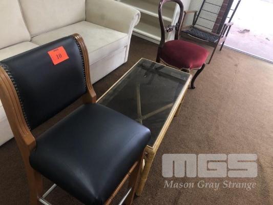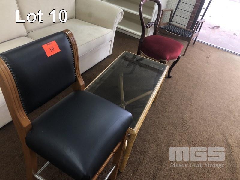 GLASS TOP COFFEE TABLE & 2 x NON MATCHING CHAIRS