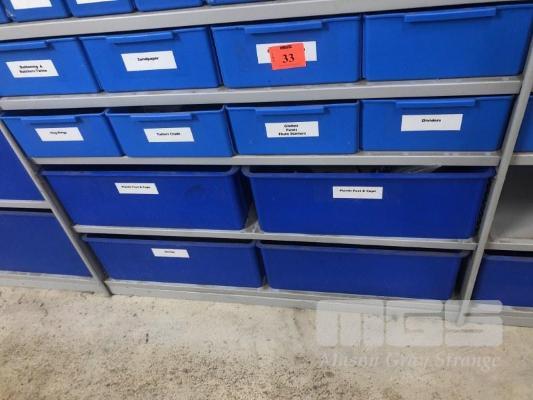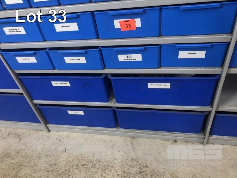 12 x PLASTIC STOCK TUBS & CONTENTS TWINE, SAND PAPER, GLOBES & FUSES, FEET & CUPS CONTENTS BOTTOM 4 x SHELVES