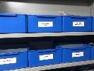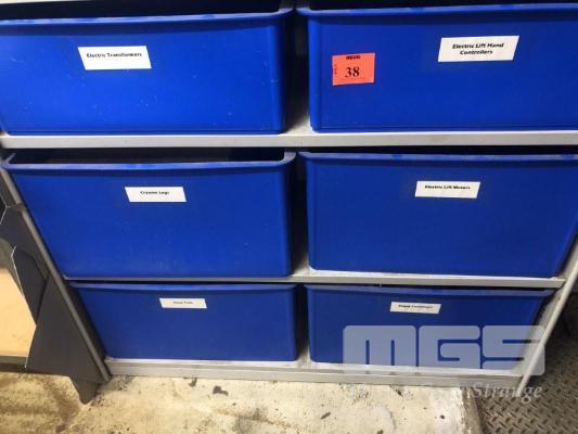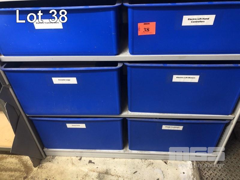 22 x BLUE PLASTIC STORAGE TUBS & CONTENTS, ELECTRIC MOTORS, SUIT LIFT CHAIRS & JASON RECLINER, ASSORTED SPARES CONTENTS RACK
