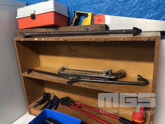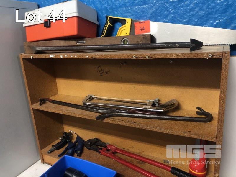 ASSORTED HAND TOOLS INC LEVEL, PINCH BARS, BOLT CUTTER, HACKSAW, DUST GUNS & TORCH