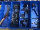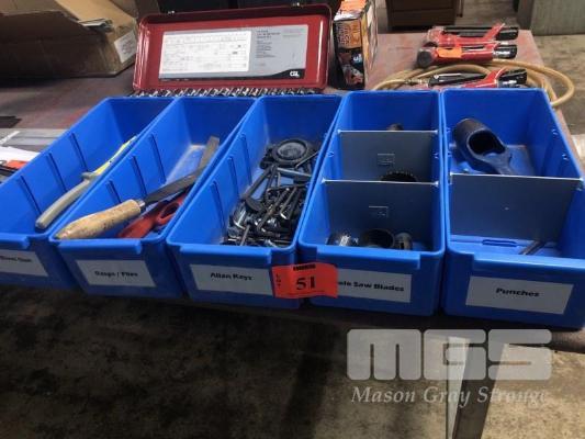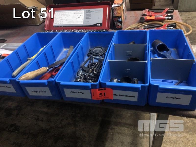 5 x BLUE PLASTIC TRAYS & CONTENTS, ROPE, RIVETER, FILES, HEX KEYS, HOLE SAW & WAD PUNCHES