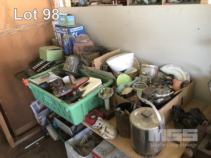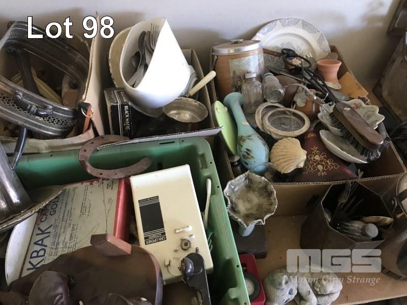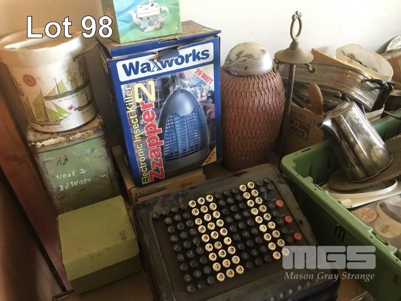 VINTAGE ADD LIST MACHINE, TERRACOTTA URN, BOXES OF HOMEWARES & ORNAMENTS