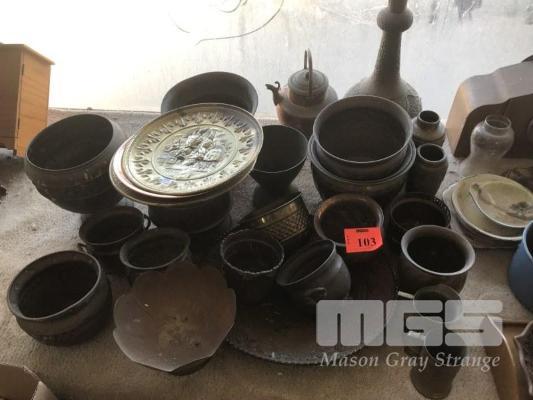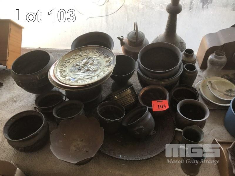ASSORTED BRASS & COPPER POTS, BOWLS, PLATES, VASES & URNS