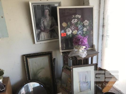 PRINTED FIRESCREEN, MIRRORS, QUEEN PORTRAIT, NEST OF TABLES