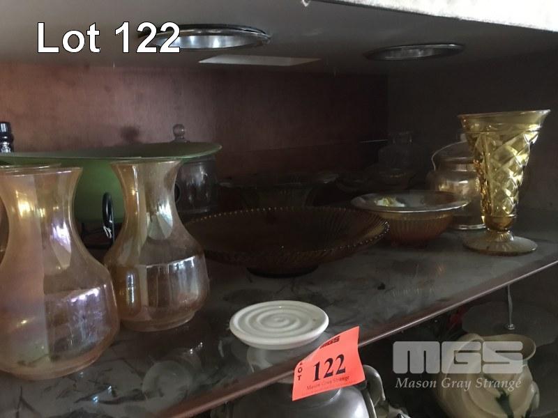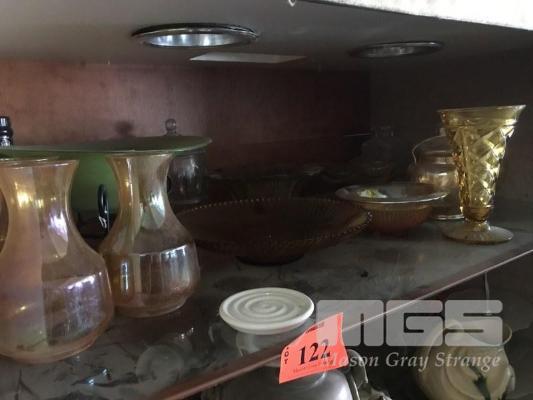 CARNIVAL GLASS, ART GLASS BOWL ON STAND, 1 x SHELF