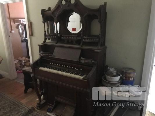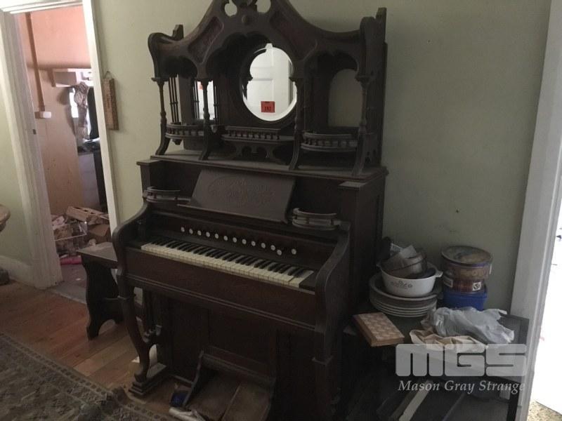 DECORATIVE CARVED TIMBER BELLOWS ORGAN, ESTRY ORGAN CO BRATTLEBORO, USA & MIRROR BACKED OVERSHELF