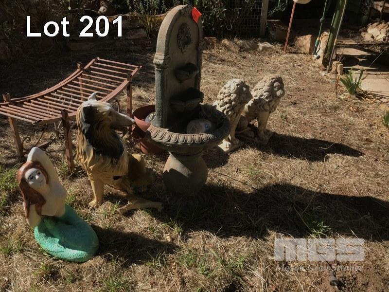 GARDEN ORNAMENTS, WATER FEATURE, PAIR LION STATUES, DOG STATUE, MERMAID ETC