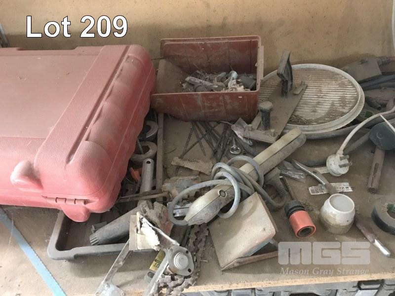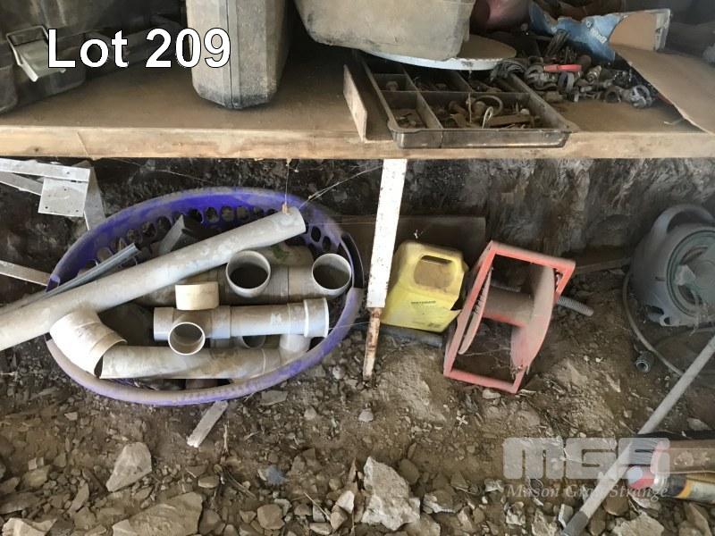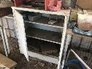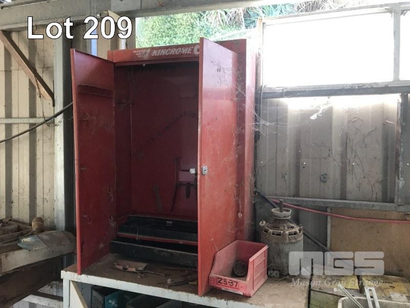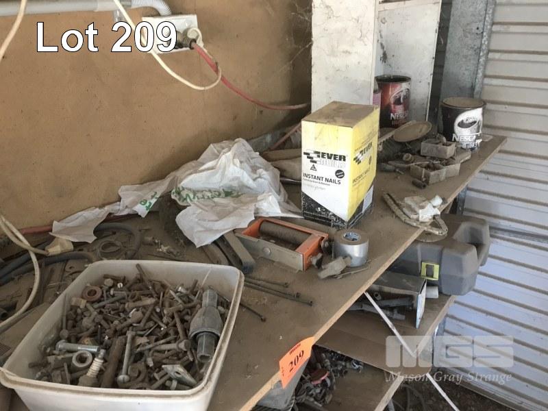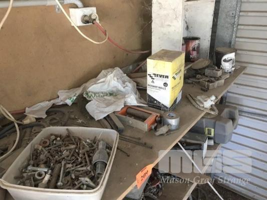 ASSORTED FASTENERS, HARDWARE, POWER TOOL STORAGE BOXES, PVC FITTINGS, RED STEEL WALL MOUNT TOOL CHEST, STEEL STORAGE CABINETS ETC