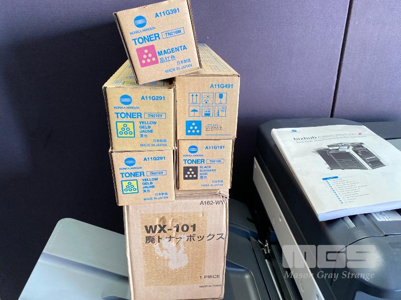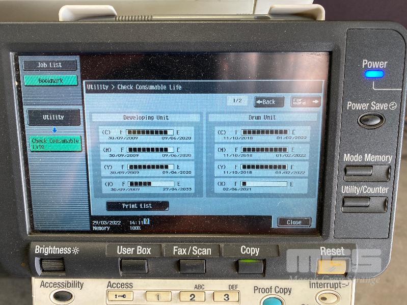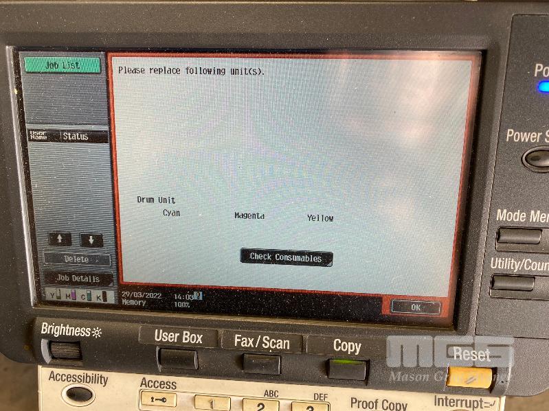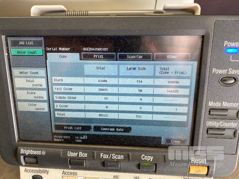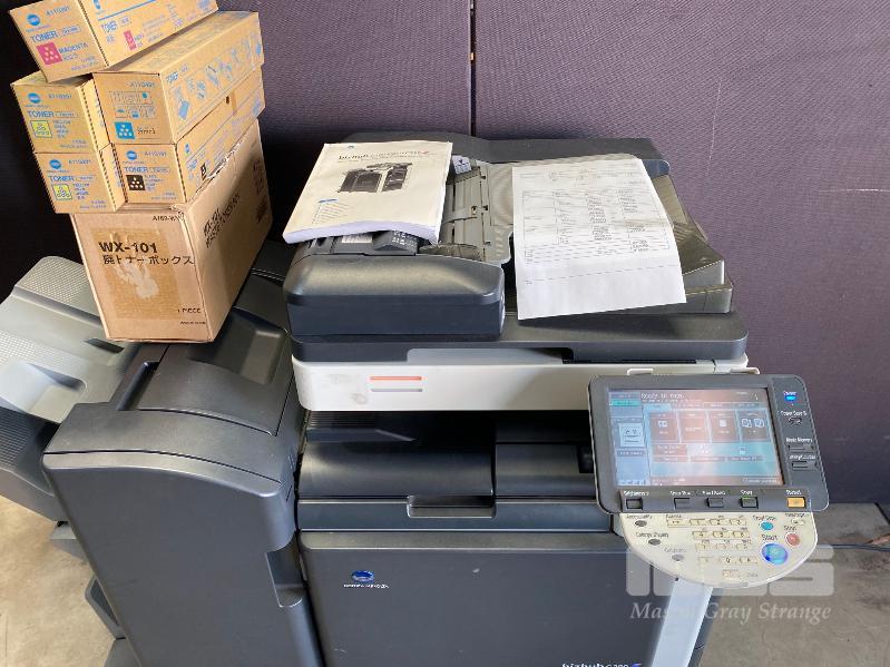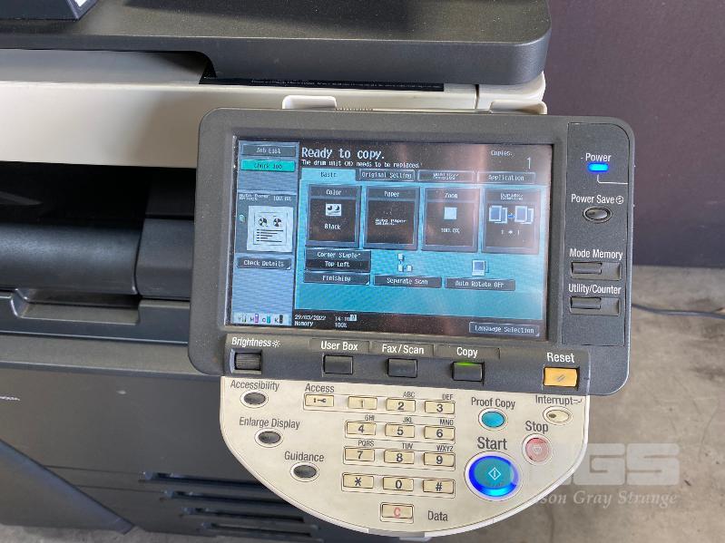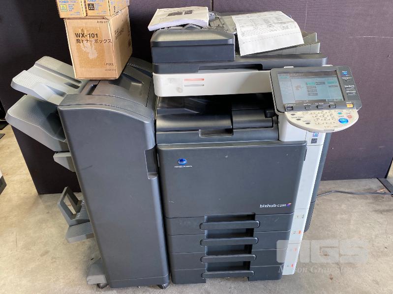 PHOTOCOPIER, KONICA MINOLTA BIZHUB C280 COLOUR DIGITAL, ADF, PRINTER USB & NETWORK PORTS, FINISHER, 144,339 COLOUR & 166,396 B&W COPIES SHOWING (TEST PAGE ATTACHED - POOR) WITH SPARE TONER CARTRIDGES (NOTE: MESSAGE REPLACE CYAN, MAGENTA & YELLOW DRUM UNITS) S/N:A0ED042000107