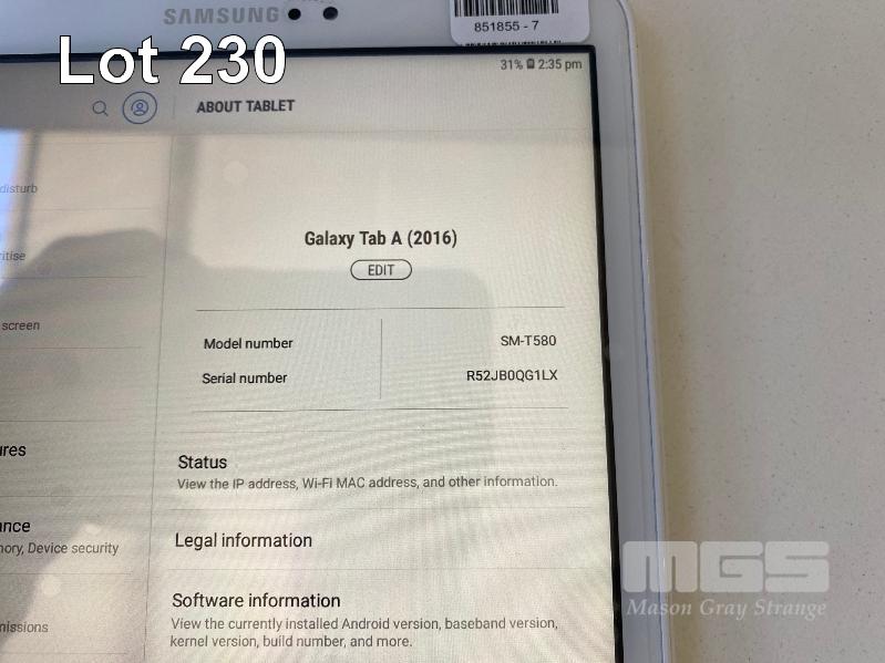 TABLET PC, SAMSUNG GALAXY TAB A6, MODEL SM-T580, 16GB, Wi-Fi, 10.1" SCREEN (NO CABLE, NO CHARGER) S/N:R52JB0QG1LX