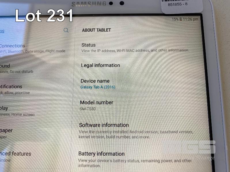 TABLET PC, SAMSUNG GALAXY TAB A6, MODEL SM-T580, 16GB, Wi-Fi, 10.1" SCREEN (NO CABLE, NO CHARGER) S/N:R52JB08APYR