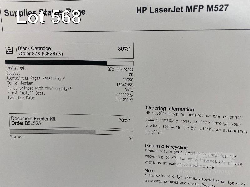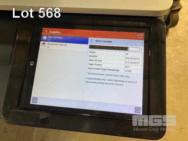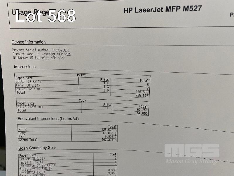 PRINTER, HP LASERJET ENTERPRISE MFP M527, ADF, USB, NETWORK, 299,551 PAGES (TEST PAGE ATTACHED) S/N:CNBXJ2387C