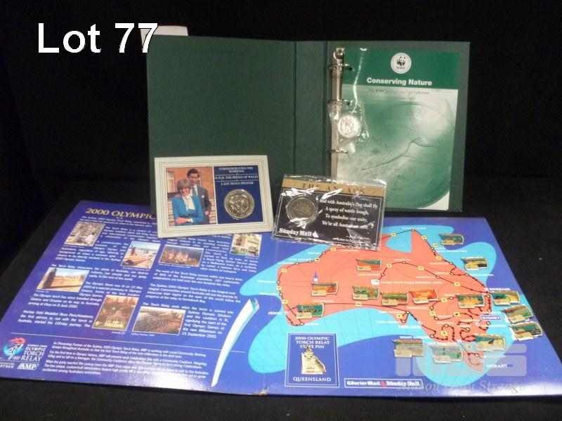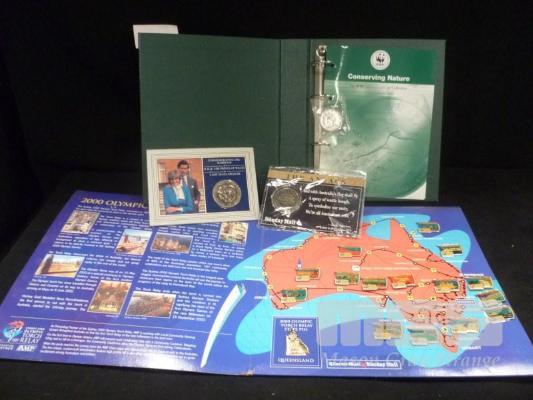 ASSORTED ITEMS, LADY DI COIN, 2000 TORCH RELAY PINS IN FOLDER, PLUS OTHERS COMMEMORATIVE ITEMS