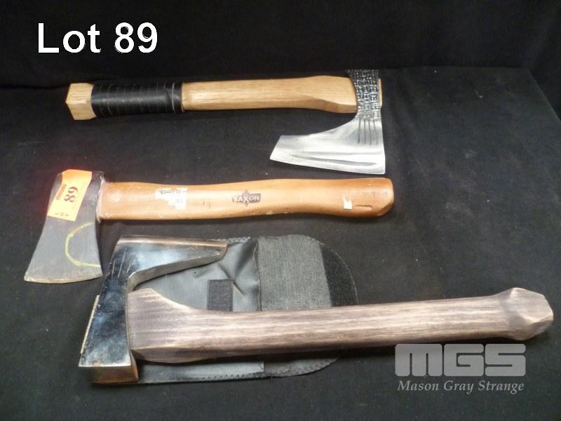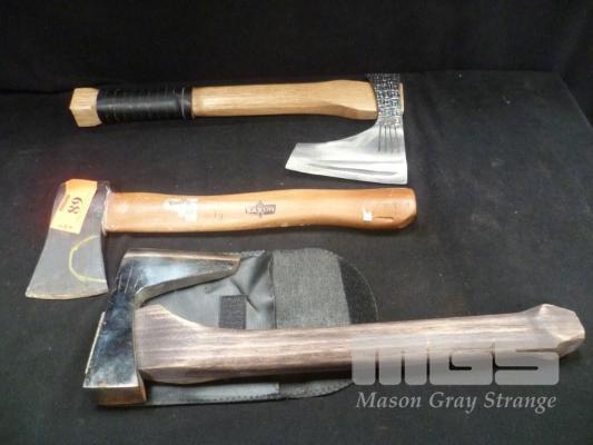 2 x HANDCRAFTED REPRODUCTION VIKING STYLE HAND AXES AND "SAXON" HATCHET