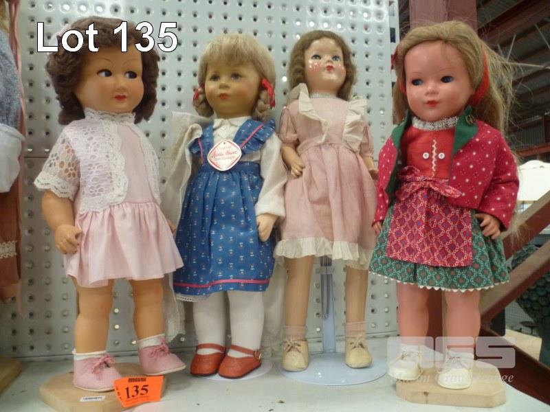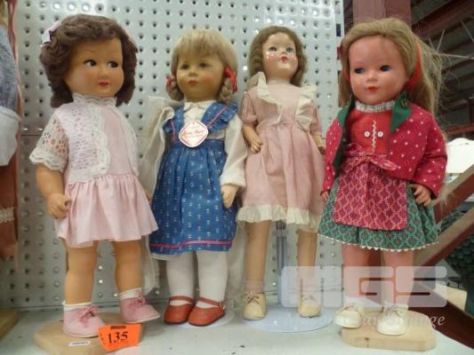 4 x PLASTIC DOLLS, YOUNG GIRLS ON STANDS, 42-50cm (H)